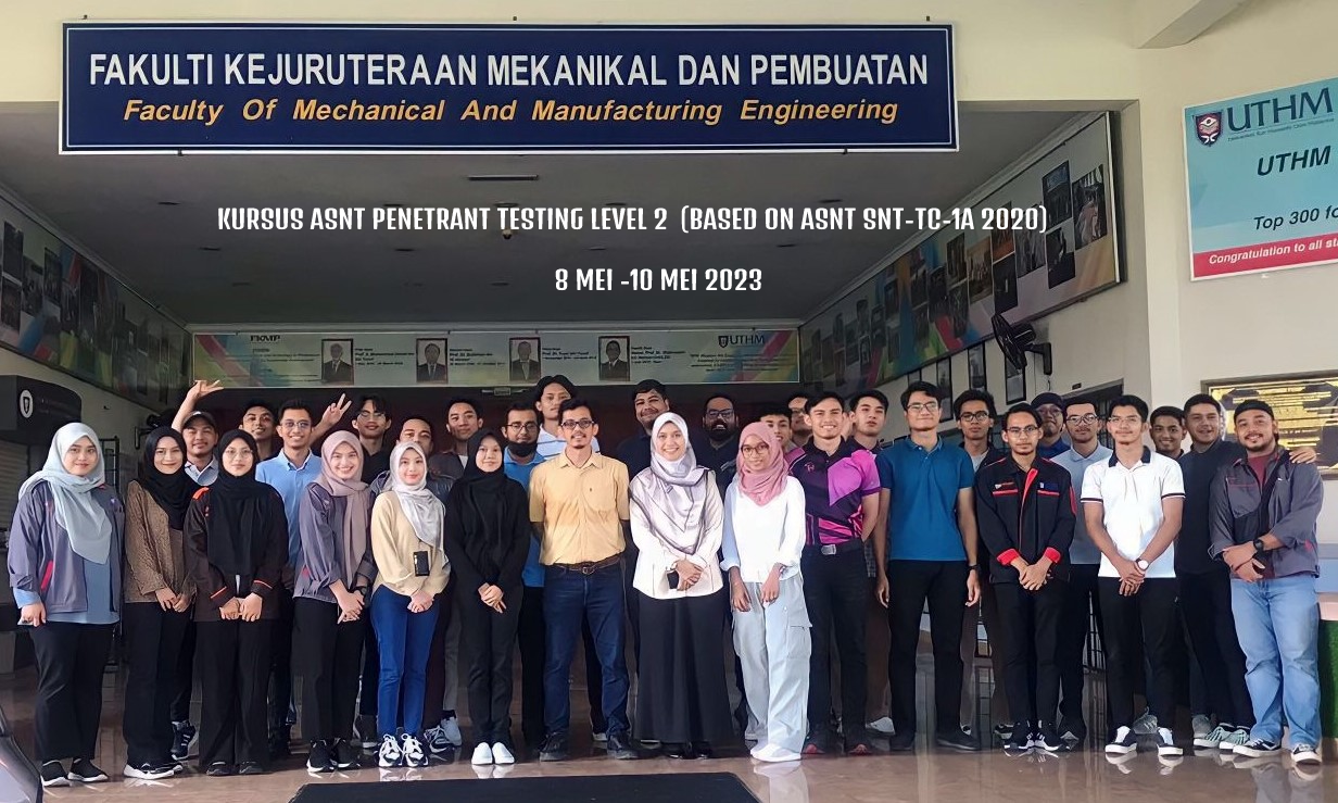 A program organized by CeNDTeC, was held from 8th to 10th May 2023. The program, ASNT Penetrant Testing Level 2 was conducted at Fluid Mechanics Laboratory, Faculty of Mechanical and Manufacturing Engineering, Universiti Tun Hussein Onn Malaysia (UTHM) Johor. A total of 30 Mechanical Engineering students were selected from various programs in the faculty. This program was fully sponsored by KPT-PACE, Ministry of Higher Learning (KPT). The instructor is certified ASNT Level 3 NDT practitioner, En Mohd Aris Fathillah bin Saleh from Arena Laksana Enterprise.
